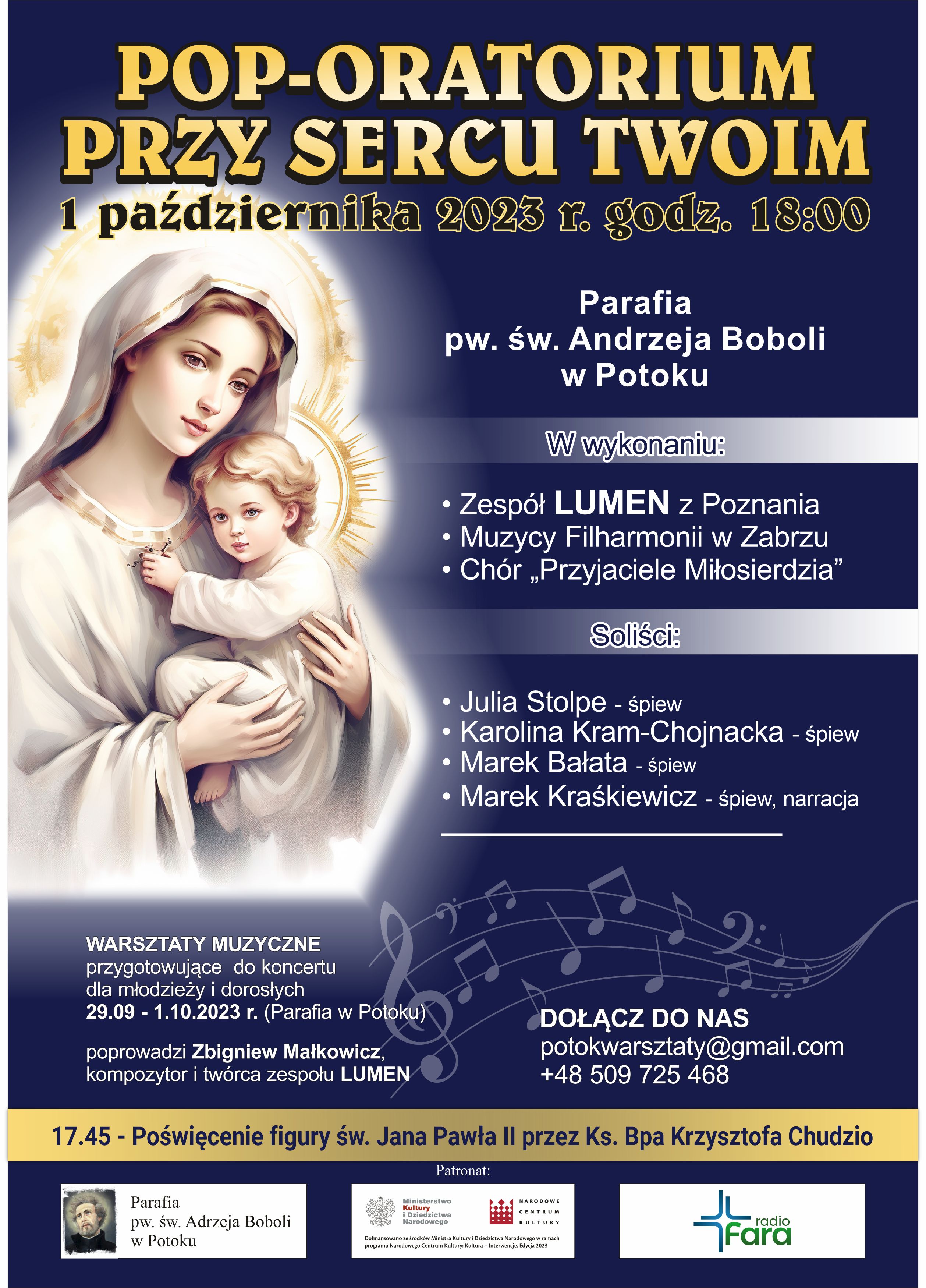 W ubiegłym roku organizowaliśmy warsztaty muzyczne, których zwieńczeniem był Koncert POP-ORATORIUM „Miłosierdzie Boże” inaugurujący „Wieczory Miłosierdzia” w naszej parafii. W obecnym roku chcemy zorganizować II edycję warsztatów i Koncert Maryjny POP-ORATORIUM „Przy Sercu Twoim”.