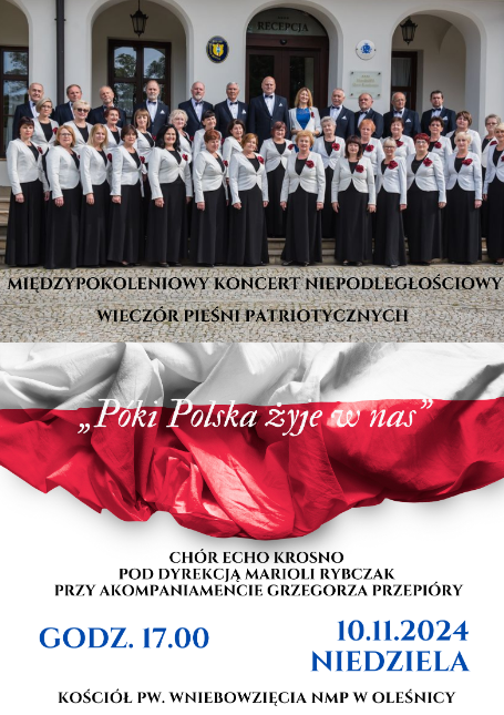 " W niedzielę 10 listopada b. r. w ramach uroczystości niepodległościowych w naszej gminie miał miejsce międzypokoleniowy koncert pieśni patriotycznych pod nazwą Póki Polska żyje w nas. Wiele znanych i kilka mniej znanych pieśni patriotycznych wykonali artyści z Chóru Mieszanego Echo z Krosna pod dyrygenturą Pani Marioli Rybczak i przy akompaniamencie Pana Grzegorza Przepióry.