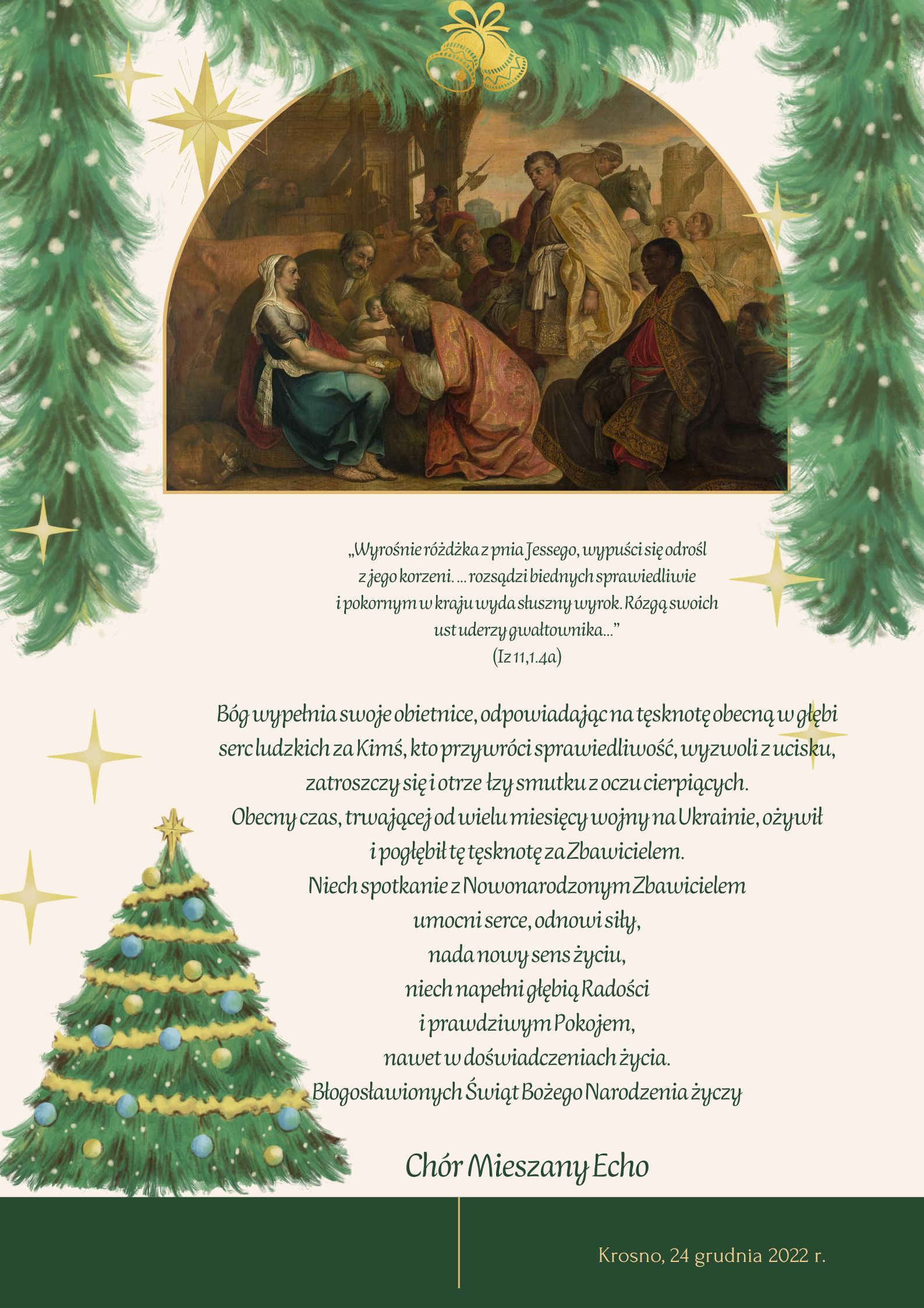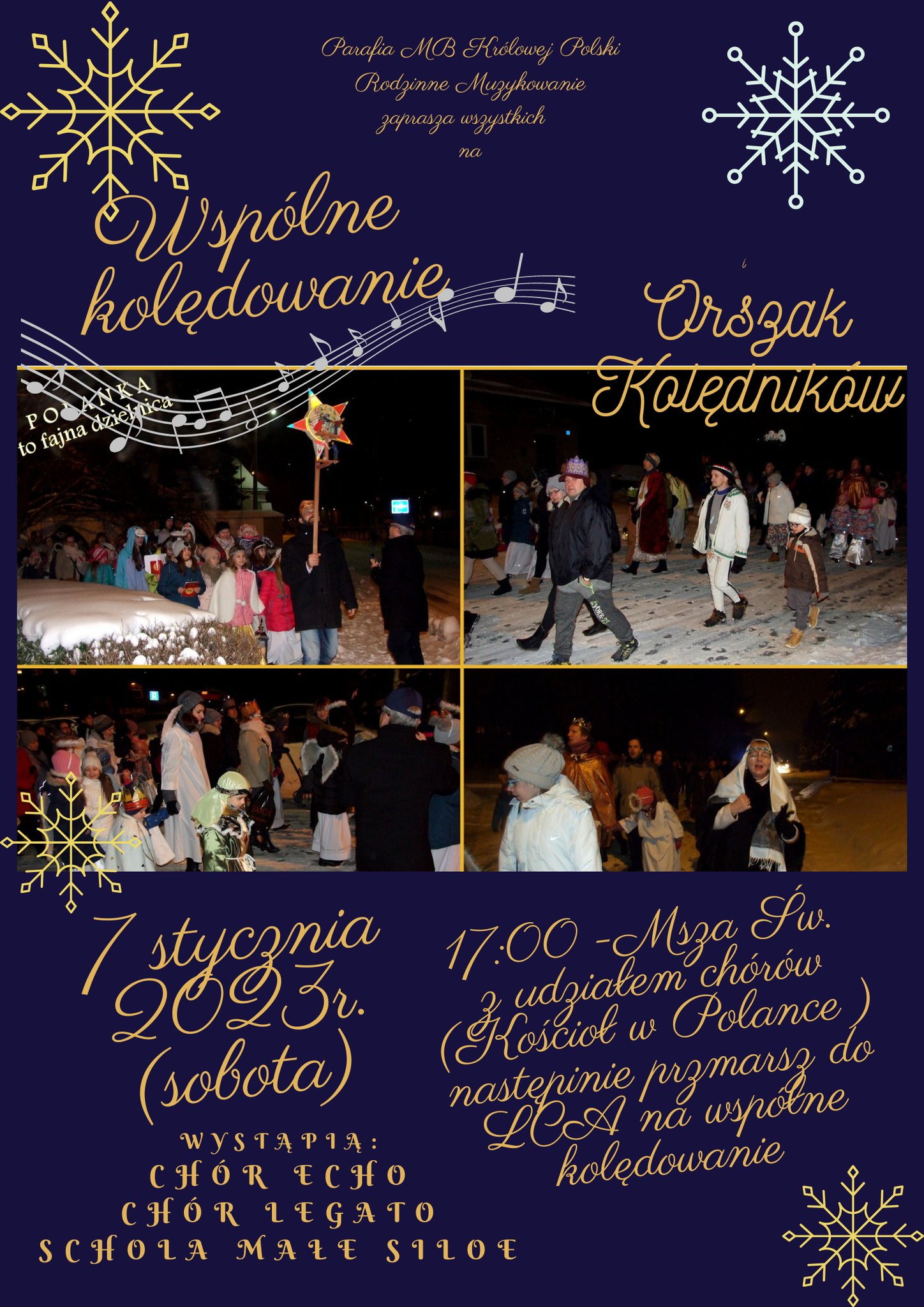 Rodzinne kolędowanie oraz uroczysty przemarsz do Domu Ludowego w Krośnie Polance miał miejsce 7 stycznia. Nasz chór na zaproszenie parafii Matki Bożej Królowej Polski wziął udział we mszy świętej z udziałem zaproszonego Chóru Legato ze Szczepańcowej. Śpiew kolęd towarzyszył nam w przemarszu do Lokalnego Centrum Aktywności. Tam też wśród przepysznych wypieków ciast i gorącego dania oraz napojów rozpoczęło się wspólne kolędowanie. Schola Małe Siloe, nasze Echo i Chór Legato wystąpiły z przygotowanym programem kolęd. a następnie ruszyli ze śpiewem licznie zebrani mieszkańcy dzielnicy. Całe wydarzenia prowadziła z właściwym sobie wdziękiem, niezawodna prezesa Agnieszka Socha.